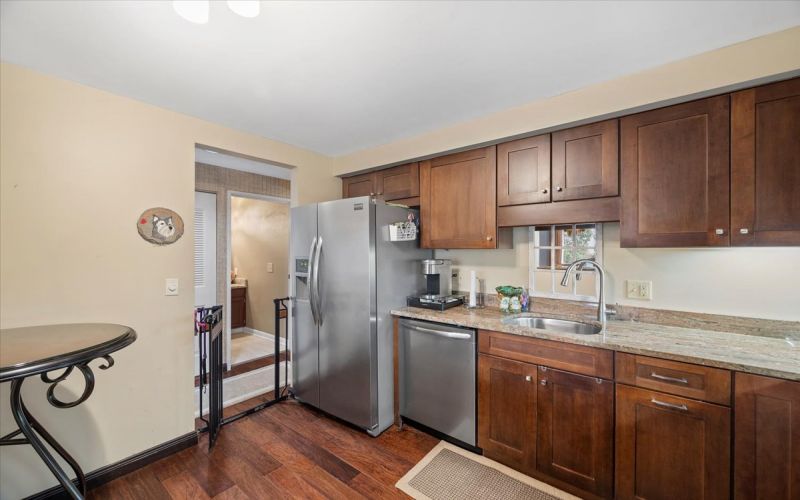 Pristine Remodeled End Unit Townhome in THE MEWS boasting a fabulous location backing Greenspace, Basketball & Tennis Courts; Newer Entry Doors, Neutral Decor, Open Air Staircase with Large Picture Window; Elegant Wide Plank Hardwood Floors in Living Room, Modern Fireplace, Exterior Window & Glass Doors to Rear Entertaining Patio with Privacy Screen/Shed; Dining Room Hardwood, Glass Doors to Front Balcony & Granite Serving Ledge OPEN to Updated Granite Kitchen with sleek Stainless Hardware & Appliances, Hardwood & coordinating Shaker Cabinetry; Spacious Master Suite with Private Master Bath & Walk-in Closet; 2 more additional Bedrooms & 2nd Full Bath located on upper level; Ceiling Fans, Granite Bath Vanities; Lower Level Gameroom TV/Sitting Area with Laundry Built-ins & Garage access. HOA covers snow removal, landscaping, exterior maintenance, pool, tennis courts, common areas, clubhouse, WATER SEWER, BASIC CABLE & TRASH REMOVAL.