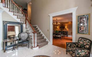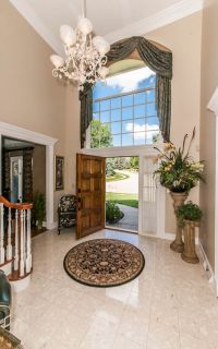 · Grande 2 Story Entry Foyer with Balcony, Aggregate Marble Flooring, Ceiling Medallion & Chandelier with Crystal Grape Accent Pieces